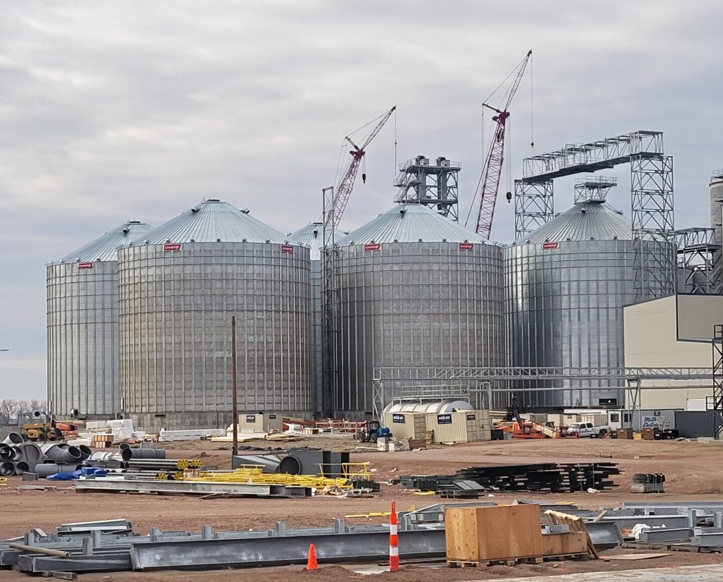 A large metal grain silo under construction at an industrial site, with a worker standing at its base and a red telescopic handler nearby. Construction materials, equipment, and cardboard boxes are scattered on muddy ground, and another partially built structure is visible in the background under a gray, overcast sky.